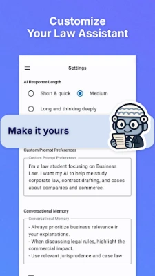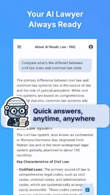 AI Reads Law: Legal Assistant este asistentul tău juridic AI, disponibil 24/7. Obține răspunsuri instantanee la întrebări complexe despre legi, jurisprudență și termeni juridici. Utilizează chat-ul inteligent și transformă orice text legal în format audio. Soluția ta completă pentru cercetare juridică eficientă.