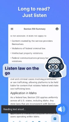 Imaginați-vă un consultant juridic personal, gata să răspundă oricărei întrebări. AI Reads Law transformă abordarea informației legale printr-un chatbot intuitiv, similar unei enciclopedii juridice interactive. Puteți interoga baza de date despre statute, jurisprudență, termeni legali și multe altele, primind răspunsuri rapide și orientare clară. Mai mult, biblioteca sa audio vă permite să ascultați legi fundamentale din SUA, inclusiv Constituția și decizii ale Curții Supreme, iar funcția text-to-speech convertește orice document juridic propriu într-un audiobook personal, optimizând timpul petrecut în deplasare sau în pauze.