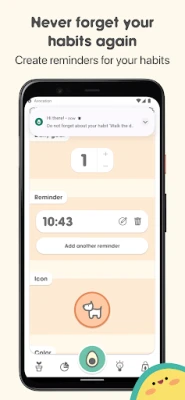 Avocation simplifică gestionarea obiectivelor și a rezoluțiilor. Creați-vă rutinele personalizate și vizualizați-le intuitiv sub formă de cercuri colorate, oferindu-vă o imagine de ansamblu rapidă asupra listei zilnice. Personalizați fiecare obicei cu pictograme și culori distincte, iar cu sistemul de notificări inteligente, nu veți uita niciodată sarcinile importante. Odată îndeplinit un obicei, un simplu clic pe cercul corespunzător vă permite să înregistrați progresul. Mai mult, urmăriți-vă evoluția prin ecranul de statistici, unde o sticlă de apă se umple simbolic cu fiecare acțiune îndeplinită. V-ați omis să înregistrați o acțiune din ziua precedentă? Nicio problemă! Funcția "Călătorie în timp" vă permite să reveniți cu o zi în urmă pentru a corecta orice omisiune, asigurându-vă că progresul dumneavoastră rămâne impecabil. Pe măsură ce sticla se umple, veți asista și la creșterea unei adorabile plante virtuale, o metaforă vizuală a propriei dumneavoastră dezvoltări.