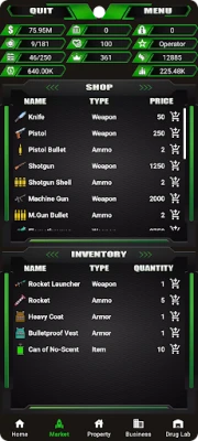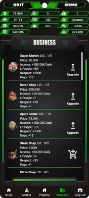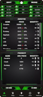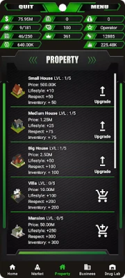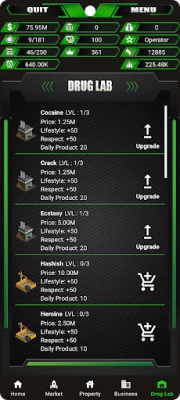 De la un simplu traficant stradal la un baron respectat al cartelului, ascensiunea voastră depinde de inteligența strategică. Gestionați cu măiestrie un imperiu clandestin ce se întinde peste 15 orașe, navigând prin piețe volatile pentru 17 tipuri distincte de droguri. Extindeți-vă influența investind în 17 laboratoare de droguri și 9 proprietăți cheie, care vă vor asigura controlul asupra teritoriului. Cu cele 19 tipuri de afaceri disponibile, veți putea genera venituri pasive și consolida fundația imperiului vostru, transformând umilele începuturi într-o hegemonie de necontestat. Fiecare decizie, de la amplasarea strategică a unei plantații de canabis până la crearea de surse sigure de depozitare, modelează destinul rețelei voastre.