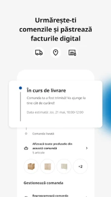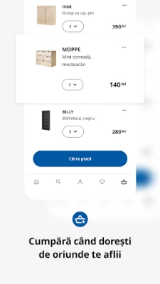 Experiența în magazin atinge un nou nivel de eficiență grație funcției inovatoare Shop and Go. Nu mai petrece timp prețios așteptând la casele de marcat; scanează pur și simplu produsele pe măsură ce le adaugi în coș și finalizează achiziția rapid. Iar dacă ai găsit piesele de mobilier sau decorațiunile ideale, dar preferi comoditatea, lasă grija transportului în seama noastră. Comandă direct prin aplicația IKEA și beneficiezi de livrare la domiciliu, având posibilitatea de a urmări în timp real statusul comenzii tale, pentru o transparență completă și o liniște sufletească garantată.